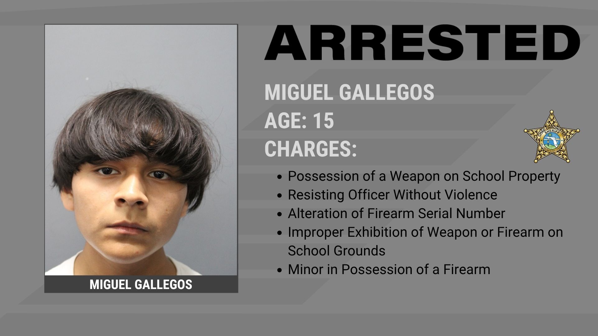 Gallegos was arrested and is being charged with Possession of a Firearm on School Grounds, Possession of a Weapon on School Grounds, Minor in Possession of a Firearm, Resisting Without Violence and Altering a Serial Number on a Firearm.