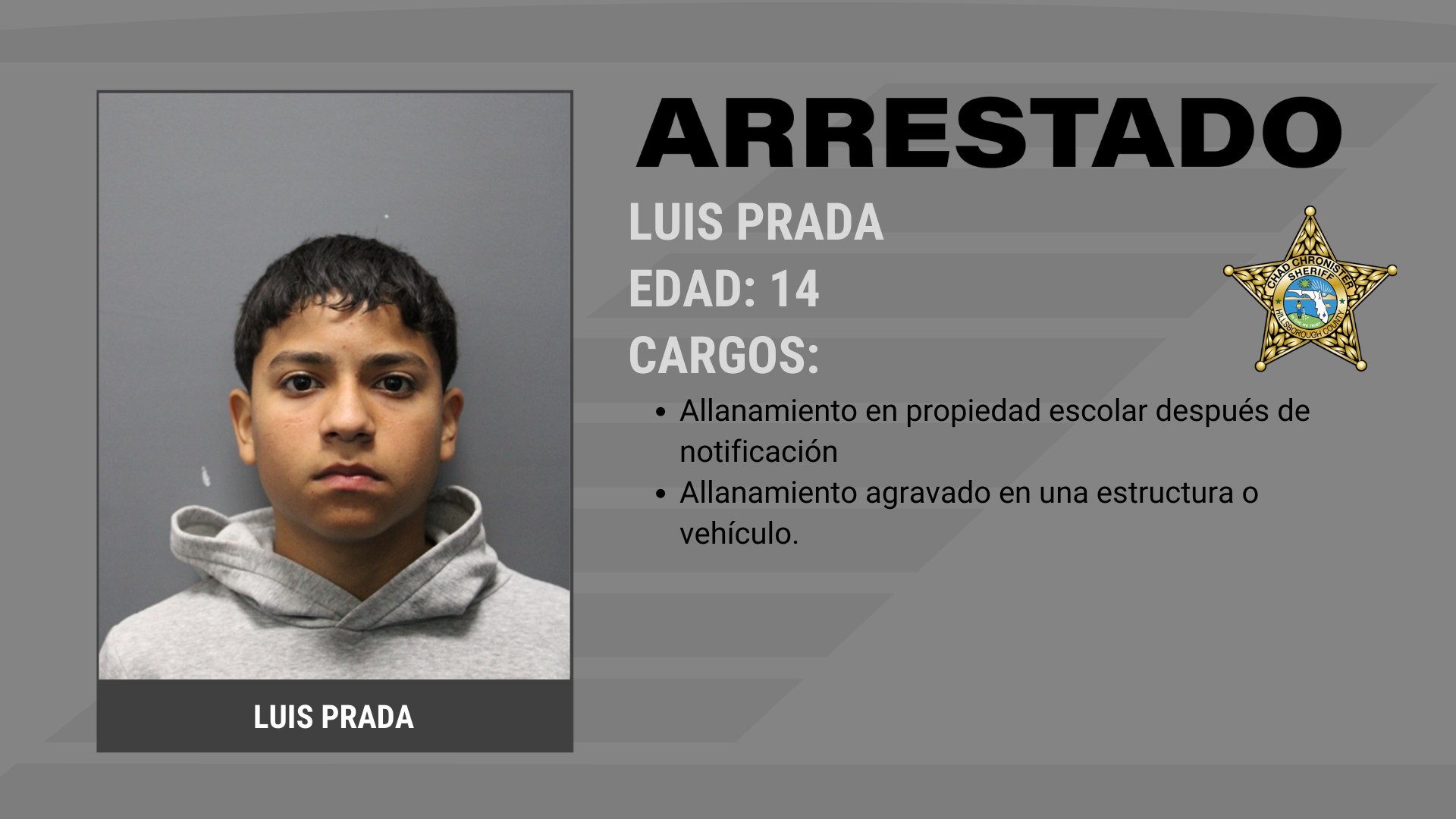 Prada fue arrestado y enfrenta cargos por Allanamiento en Propiedad Escolar Después de Notificación y Allanamiento Agravado en una Estructura o Vehículo.